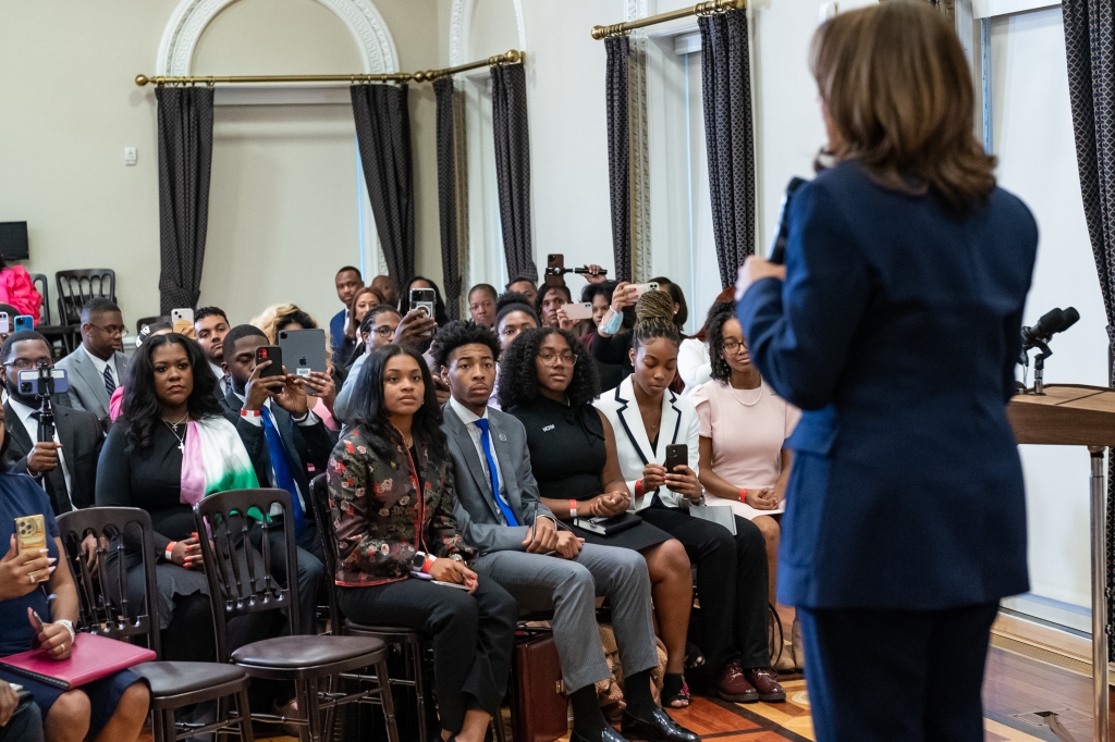 HBCU students listen to Vice President Kamala Harris speak during the press briefing. Photo courtesy of Erica Lowe / White House Director of African American Media